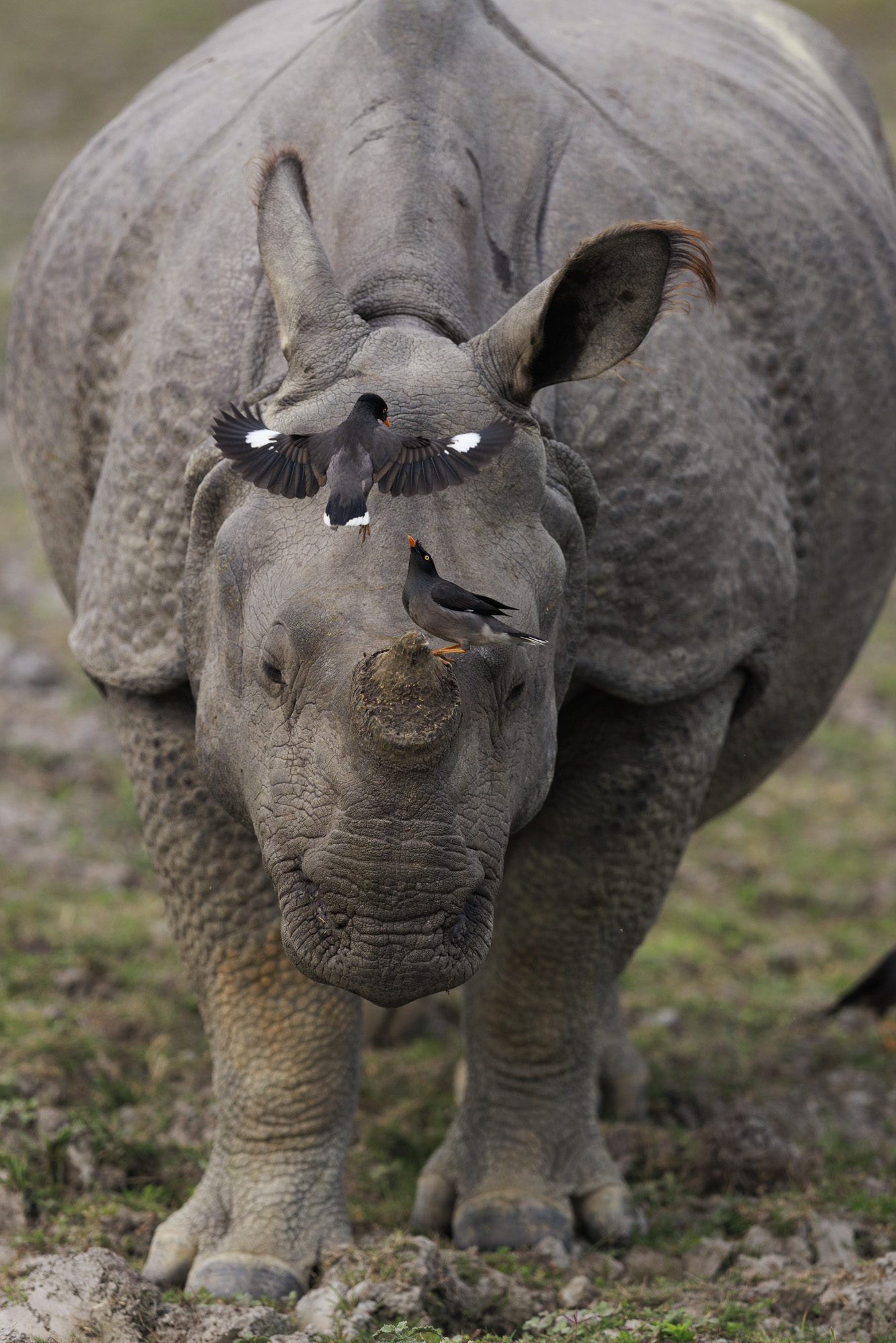 Indian Rhinoceros (Rhinoceros unicornis) adult, with Jungle Myna (Acridotheres fuscus) perched Kaziranga National Park, Assam, India Rhinocéros indien (Rhinoceros unicornis) avec des martins forestiers (Acridotheres fuscus) PN de Kaziranga, Assam, INDE
