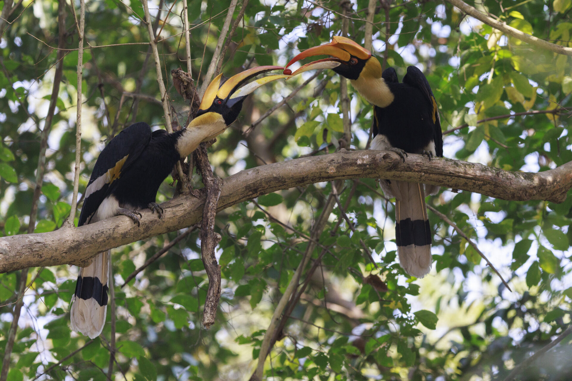 Great hornbill (Buceros bicornis) Courtship, Kaziranga National Park, Assam, India. Calaos bicorne (Buceros bicornis) paradant, Kaziranga NP, INDE