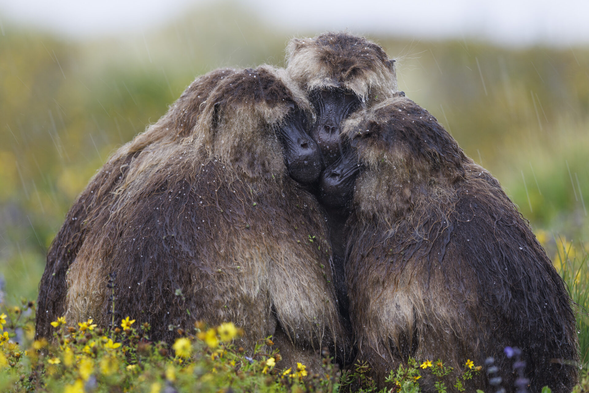 Gelada Baboon (Theropithecus gelada), Gelada huddled together under heavy rains. high plateau 3200m asl, end of the rainy season. Simien Mountains National Park, Ethiopia Géladas (Theropithecus gelada) blottis les uns contre les autres sous une forte pluie. Haut plateau 3200m à la fin de la saison des pluies. Parc national Simien, Ethiopie