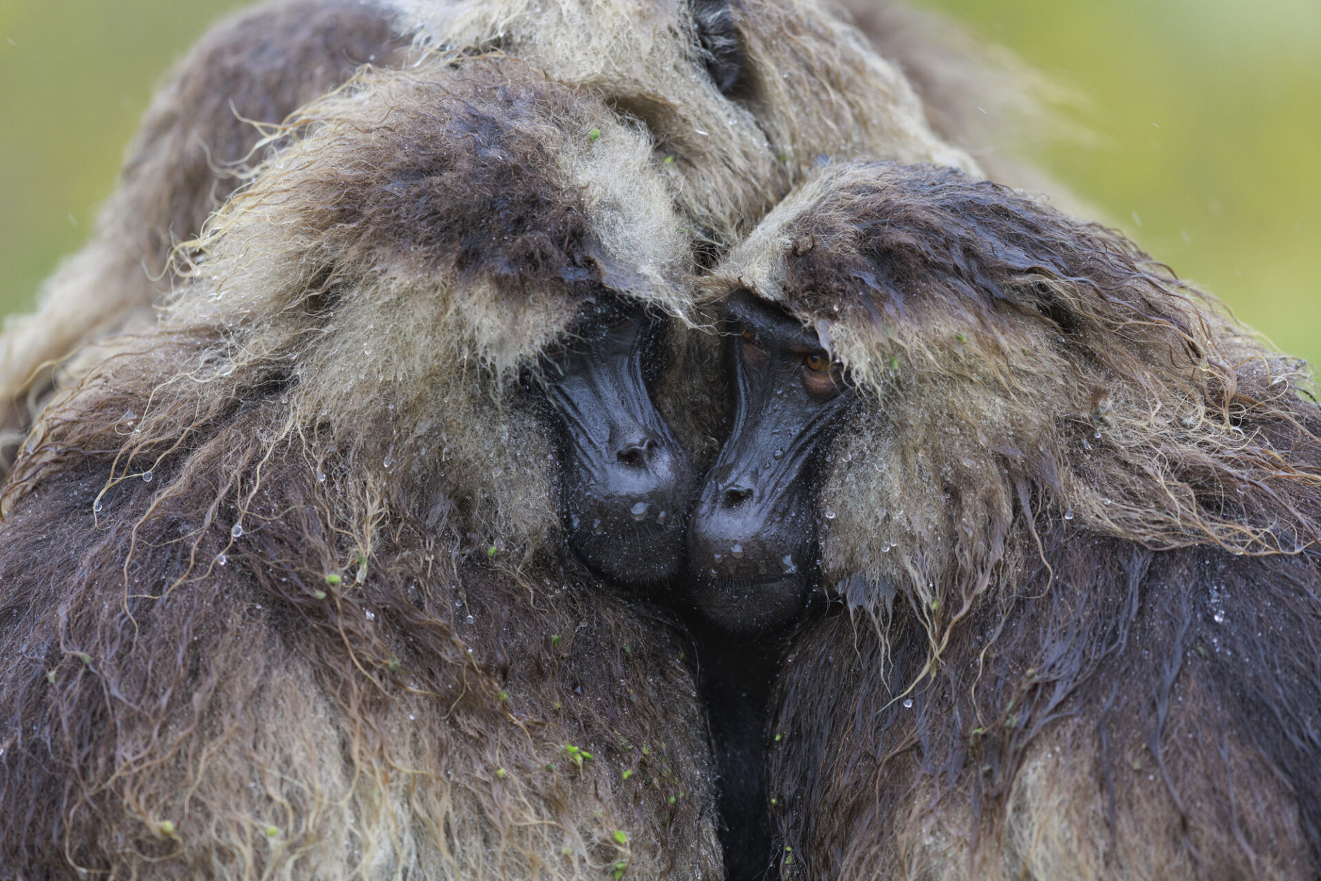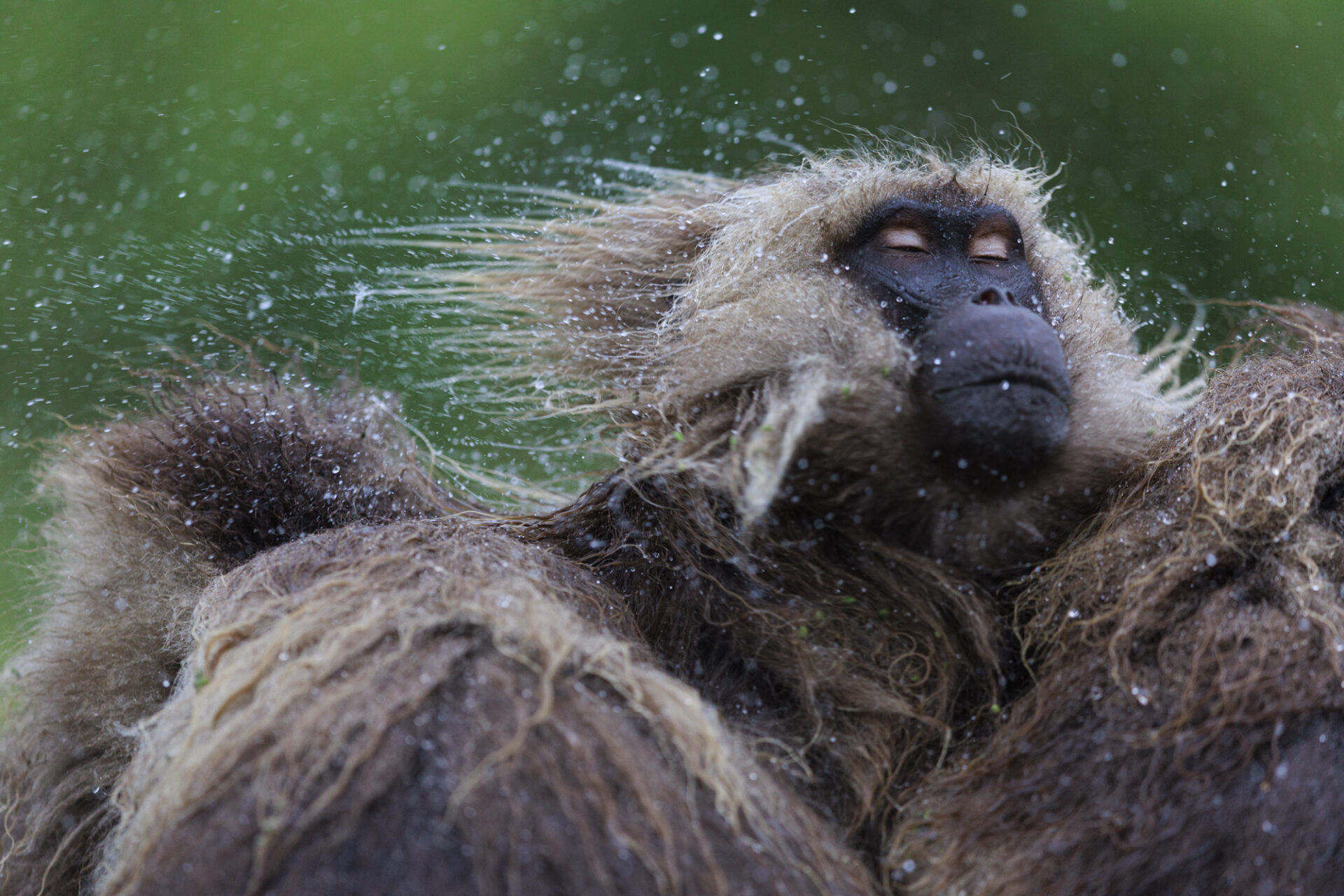 Gelada Baboon (Theropithecus gelada), Gelada saking rain from fur. Gelada huddled together under heavy rains. high plateau 3200m asl, end of the rainy season. Simien Mountains National Park, Ethiopia Géladas (Theropithecus gelada) s'ébroue. Géladas blottis les uns contre les autres sous une forte pluie. Haut plateau 3200m à la fin de la saison des pluies. Parc national Simien, Ethiopie