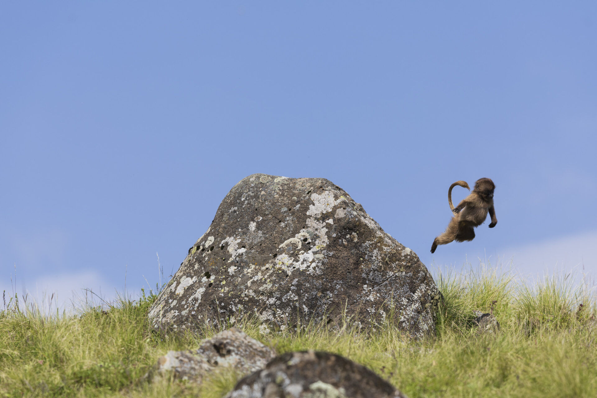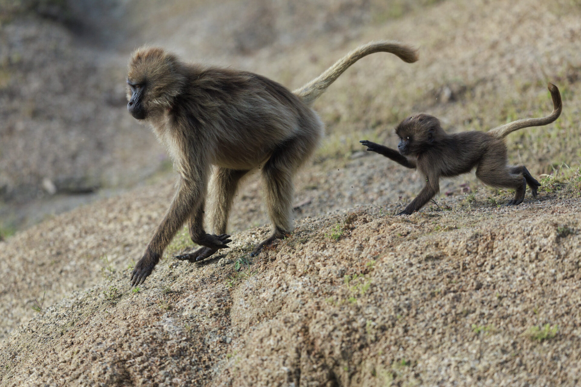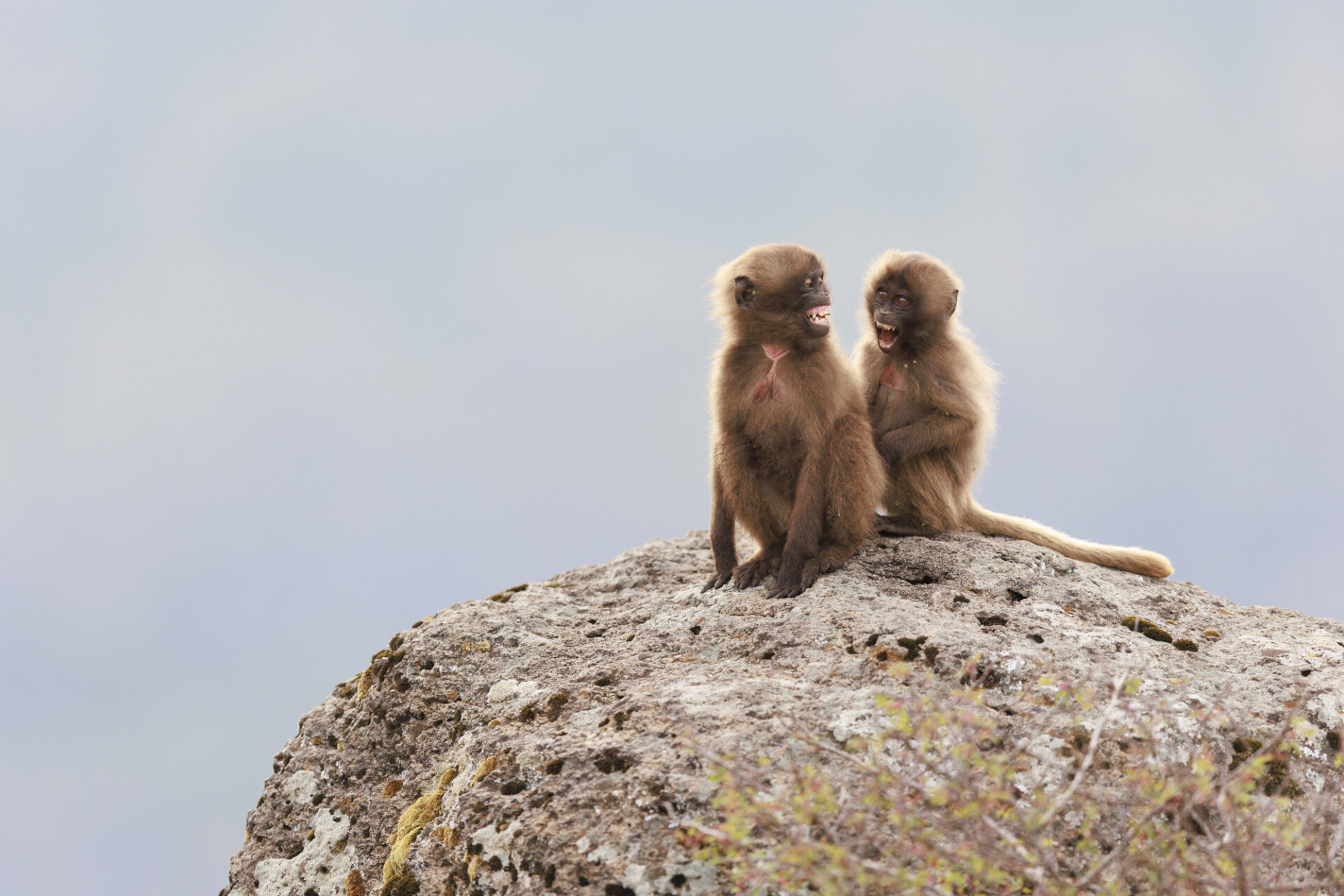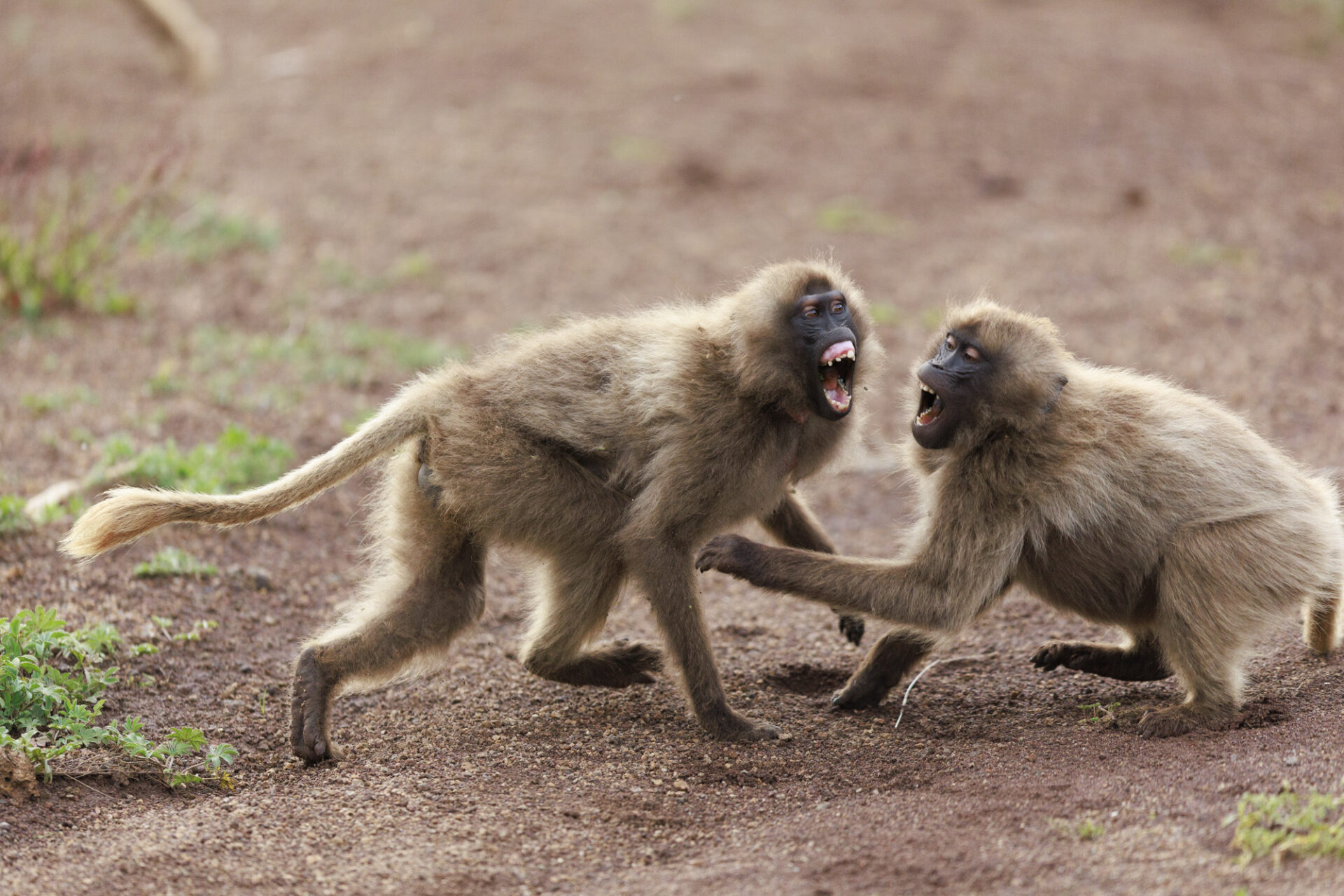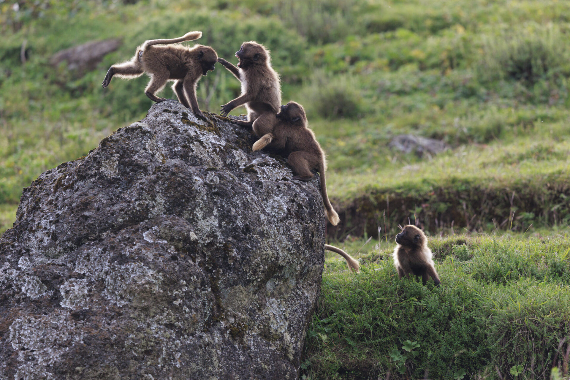 Gelada Baboon (Theropithecus gelada), Juveniles playing. Simien Mountains National Park, Ethiopia Géladas (Theropithecus gelada) jeux entre Juvéniles Parc national Simien, Ethiopie