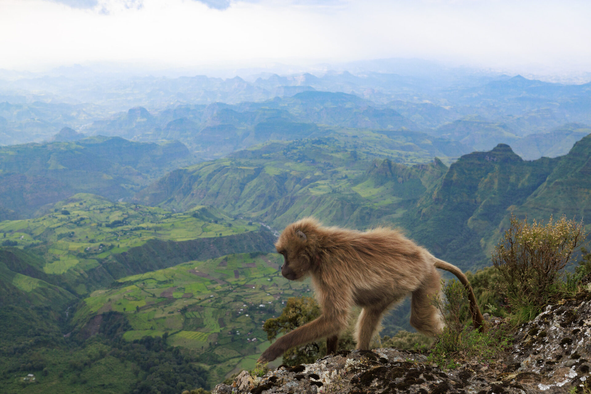 Gelada Baboon (Theropithecus gelada), Female at the edge of the cliff, before night. Simien Mountains National Park, Ethiopia Géladas (Theropithecus gelada) femelle au bord de la falaise où le groupe passera la nuit. Parc national Simien, Ethiopie