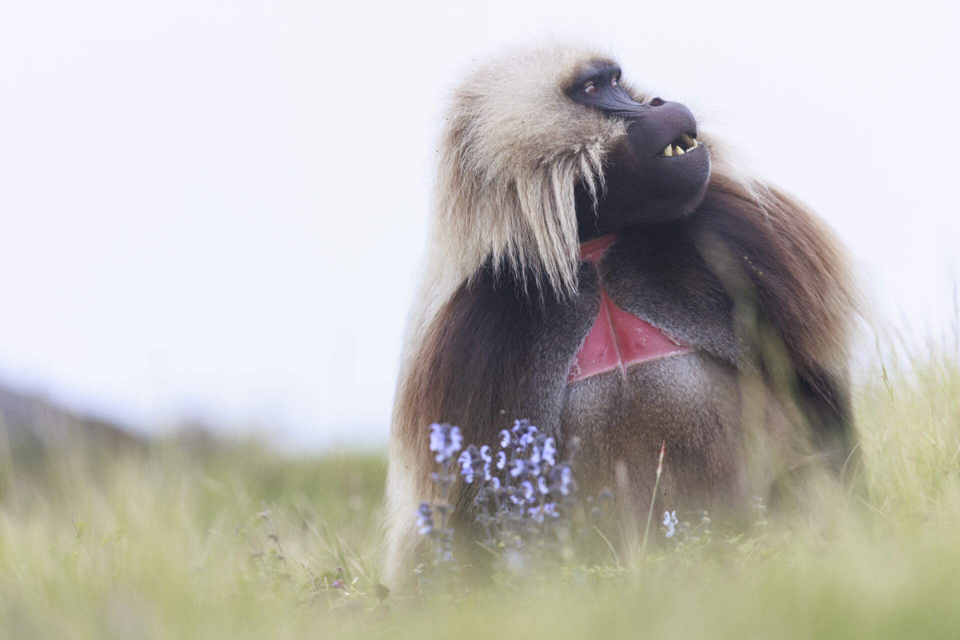 Gelada Baboon (Theropithecus gelada), Male on a foggy high plateau 3200m asl, end of the rainy season. Simien Mountains National Park, Ethiopia Géladas (Theropithecus gelada) Mâle sur un haut plateau 3200m à la fin de la saison des pluies, dans le brouillard. Parc national Simien, Ethiopie