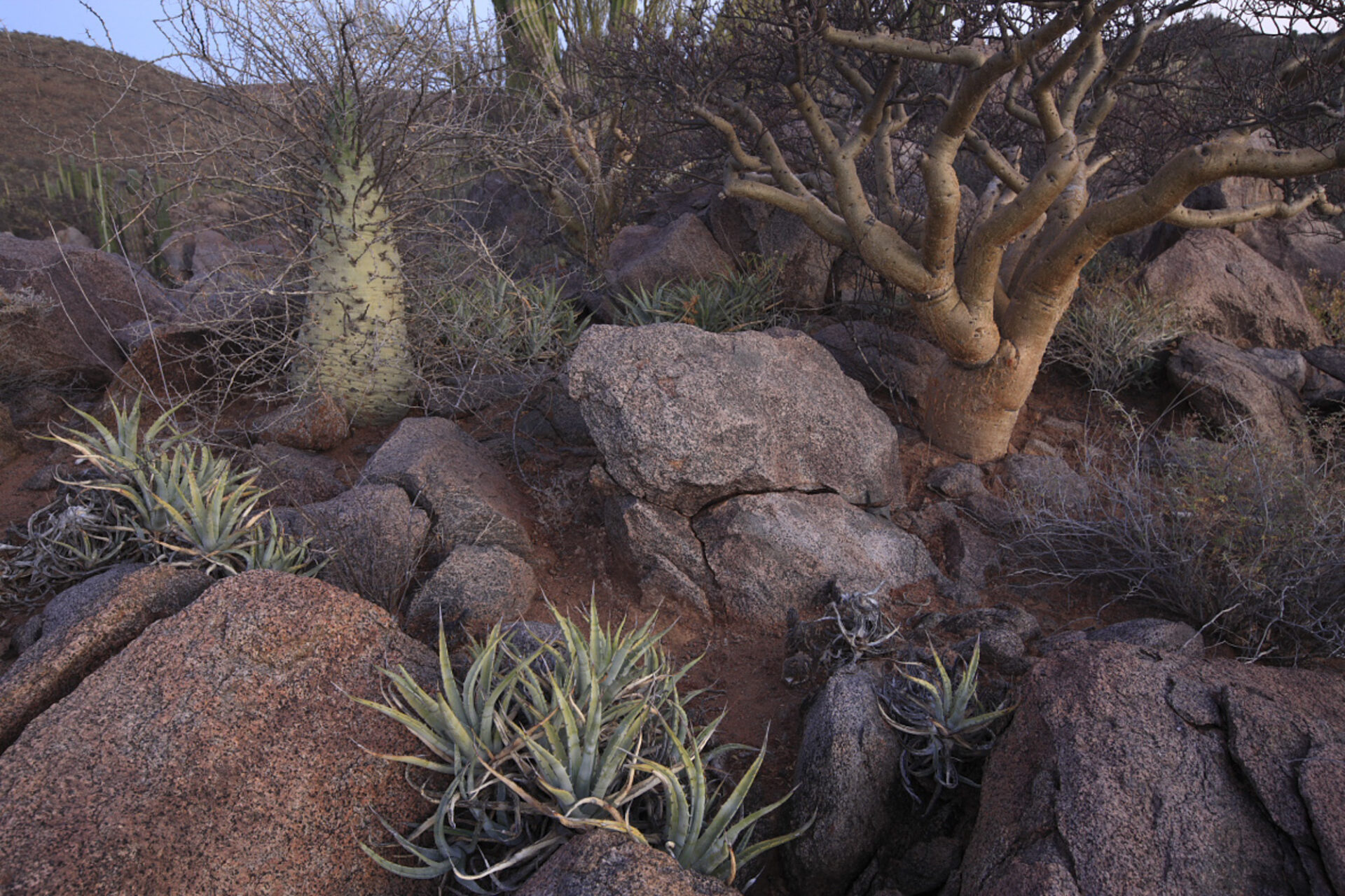 Gommier / Elephant tree / Bursera microphylla Cactus cardère / Elephant cactus / Pachycereus pringlei et Boojum / Fouquiera columnaris Désert de Vizcaino Reserve de biosphère Basse Californie Mexique