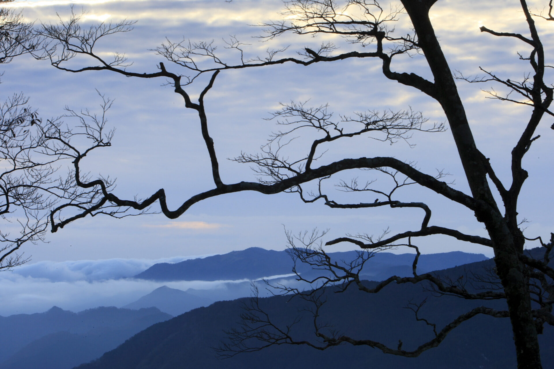 Vue depuis la montagne sacrée d'Omine-San au lever du soleil,traversée par le chemin de pélérinage Kumano Kodo La montagne Omine est une montagne sacrée pour les adeptes du Shugendo, une tradition de 12 siècles japonaise où la relation entre la nature et l'homme est primordiale. Le but du Shugendo est le developpement de pouvoirs spirituels grâce à la pratique de l'ascèse. Cette montagne est interdite aux femmes encore aujourd'hui. PN Yoshino-kumano Région de Kansaï JAPON
