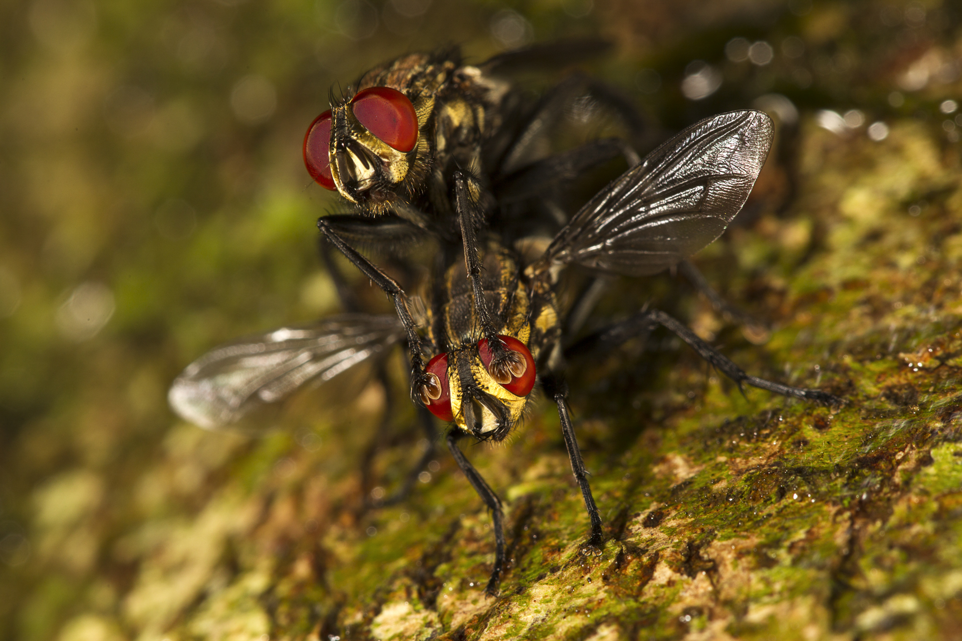 Mouche parasite / Calodexia sp Tachinidae Ces mouches accompagnent les fourmis légionnaires pour déposer leurs larves sur les blattes et autres orthoptères qui fuient. Forêt tropicale sur l'île de Barro Colorado sur le lac Gatùn, canal de Panama. PANAMA Red eyed fly / Calodexia sp from Tachinidae family are known to accompany army ants. The flies deposit larvae on cockroaches and other orthopterans fleeing the army ants. Tropical rain forest. Barro Colorado island, Gatun lake, panama canal. PANAMA