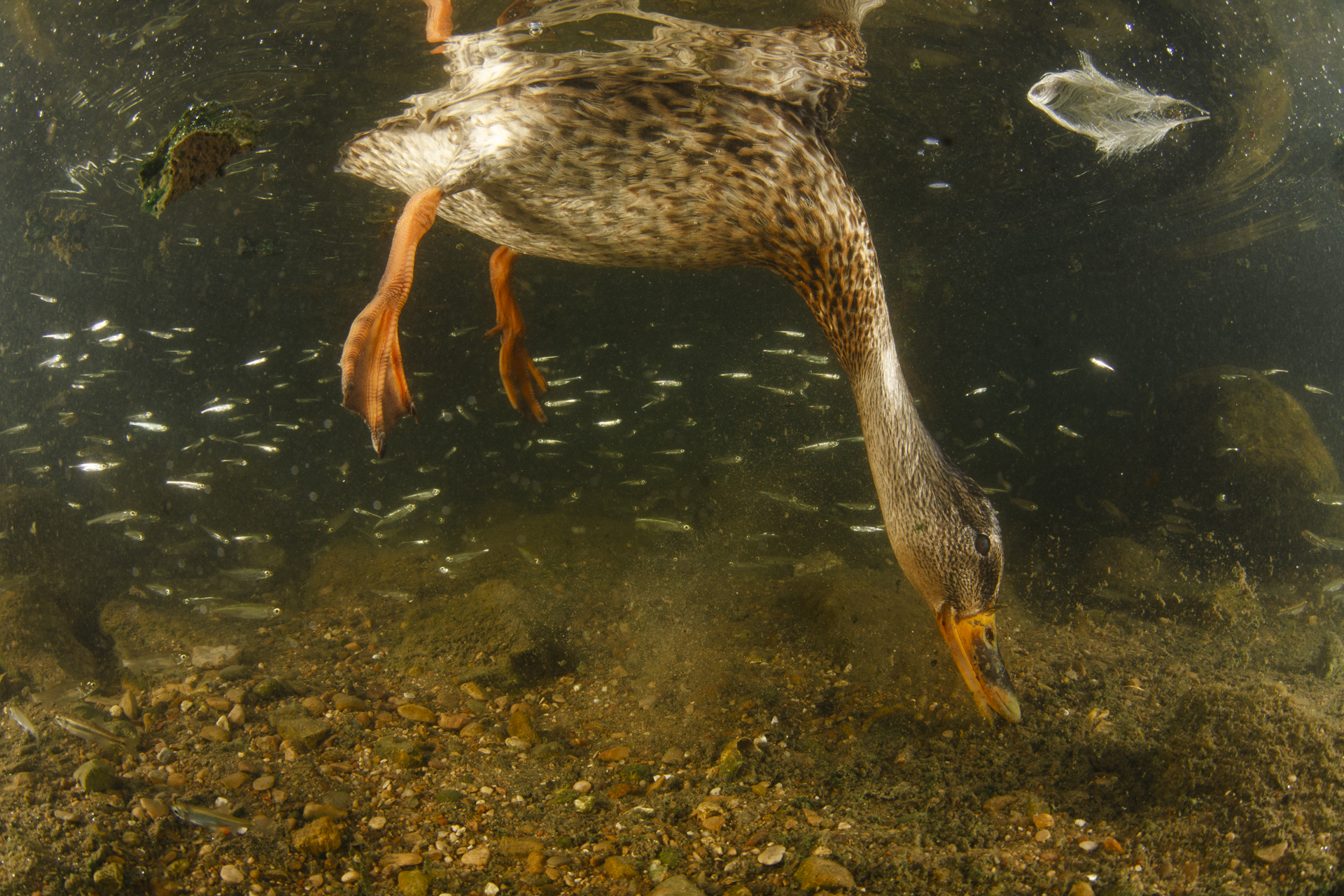 Mallard (Anas platyrhynchos) Female eating underwater. Yonne river FRANCE Canard colvert (Anas platyrhynchos) fouille le fond de l'Yonne. Femelle FRANCE