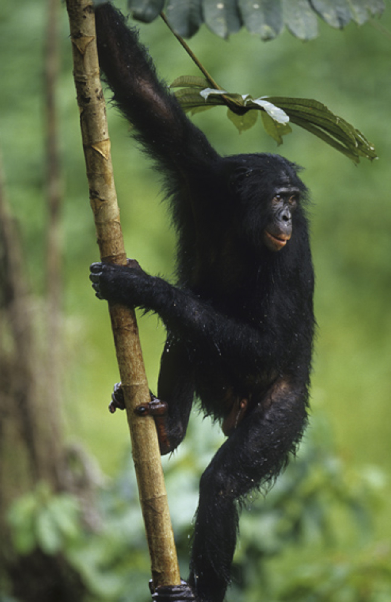 Bonobo (Pan paniscus) RDC Mâle grimpe dans un parasolier