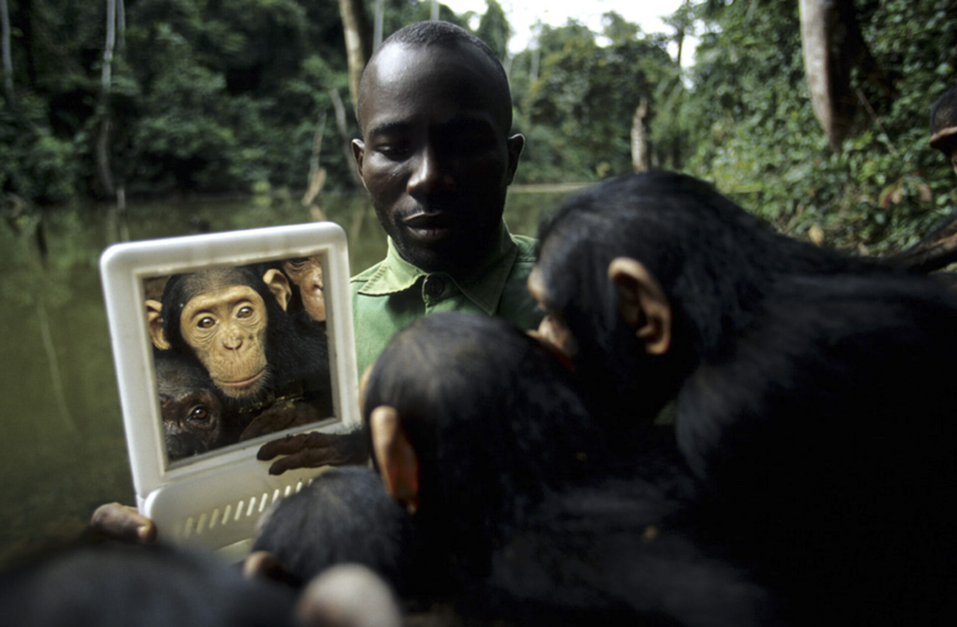 Sanctuaire de Bakoumba Chimpanzé (Pan troglodytes) GABON jeunes orphelins face au miroir GABON